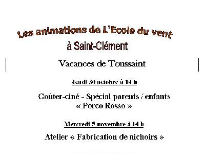 |  | activités de découverte Les animations de l'Ecole du Vent à Saint Clément Pour les vacances de Toussaint | lire |