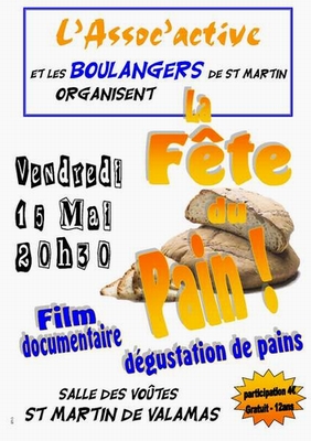 Fête du pain Du 11 au 17 mai 2009, c'est la fête du pain. Commerce de proximité par excellence, la boulangerie quitte ses murs ; c'est l'occasion de rencontrer les boulangers et de découvrir leur métier et leurs produits. Les boulangers de Saint-Martin de Valamas et l'Assoc'active vous invitent ce vendredi 15 mai à partir de 20h30, à la salle des Voûtes à la projection d'un film documentaire "Le boulanger, la pâte et le fournil" film d'Eric Vernier. Il y aura ensuite un temps d'échanges avec eux sur leur métier et ils nous feront partager leur passion. Enfin nous goûterons ensemble des pains spéciaux accompagnés de produits locaux saucisson, fromages, miel, confiture et boissons. Participation adulte 4 €.* | ||