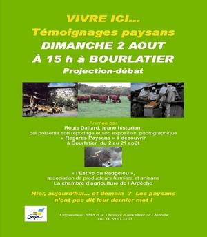 VIVRE ICI... Témoignages paysans DIMANCHE 2. AOUT A 15 h à BOURLATIER Projection-débat animée par Régis Dallard, jeune historien qui présente son reportage et son exposition photographique « Regards Paysans » à découvrir à Bourlatier du 2 au 21 août « l'Estive du Padgelou » La chambre d'agriculture de l'Ardèche Hier, aujourd'hui— et demain ? Les paysans n'ont pas dit leur dernier mot ! organisation : SMA et la Chambre d'Agriculture de l'Ardèche 06 89 07 73 51 | ||