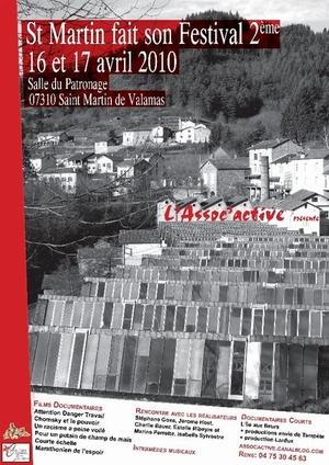 L'ASSOC'ACTIVE a le plaisir de vous informer qu'elle renouvelle l'expérience lancée en 2009 : un festival du documentaire. Il se déroulera les vendredi 16 et samedi 17 avril 2010 au patronage de st Martin de Valamas. On peut déjà annoncer quelques films de ce programme : - "Attention, danger, travail" traitant du choix de certains à ce que d'autres appellent "l'inactivité", "le non-travail"... Stéphane GOXE (co réalisateur de C.COELLO et P. CARLES)accompagnera leur film. - "Marathonien de l'espoir" pour lequel Charlie BAUER répondra à vos questions sur son expérience de 25 ans de prison et sur sa reconversion à la sociologie ou donnera sa définition de la démocratie, le pouvoir, la lutte... - "Un racisme à peine voilé" nous donnera une position que les médias de masse omettent à propos de la loi sur le voile et ce que cache cette loi. Ines, la productrice et Jérôme HOST, le réalisateur seront les intervenants. - "Chomsky,le pouvoir" pour les personnes qui ont apprécié "chomsky et cie", il est à noter qu'il ne s'agit pas là de répétition mais d'une véritable suite. On présentera aussi des moyens métrages qui porteront à discuter sur le capitalisme, la résistance, les OGM, la répression, les échanges et la solidarité entre cultures... Pour ces films encore, de nombreux réalisateurs seront présents. Quant aux cours métrages, ils sont aussi variés et divers que de qualité. Pour lier ces films et discussions, de la musique, des buffets de produits locaux, de la bonne humeur... Dès à présent, déposez vos congés, réservez un gîte, libérez-vous de toute contrainte et venez partager ces journées avec l'Assoc'Active les 16 et 17 avril 2010. Pour réserver un hébergement : PIT (point info tourisme) 04.75.64.80.97 Pour tout autre renseignement : Régine PUGI 04.75.30.45.63 | ||