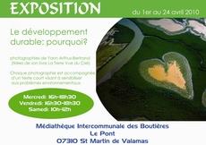 Communauté de communes des Boutières Saint martin de Valamas La médiatheque Intercommunale vous propose *L' Exposition Développement durable du 1er au 24 Avril 2010 * Photographies de Yann Arthus Bertrand accompagnées d'un texte visant à sensibiliser aux problemes environnementaux Plusieurs ouvrages sur ce theme sont disponibles Rappel des Horaires d'ouverture de la médiathèque Mercredi: 16h-18h30 Vendredi: 16h30-18h30 samedi: 10h-12h | ||