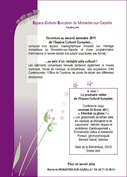 En vue de l’ouverture prochaine de l’Espace Culturel Européen du Monastier, la Mairie du Monastier a initié, depuis le mois de juin 2010, une série d’animations culturelles au sein des bâtiments conventuels. Ceux-ci, en cours de rénovation, sont destinés à devenir un véritable pôle culturel dédié autant à la musique, à l’art contemporain, qu’à la science et à la littérature, et ouvert à toutes formes d’Arts… En effet, ce patrimoine bâti d’exception devrait accueillir à terme : la bibliothèque, l’école de musique, une salle d’exposition du FRAC (Fond régional d’Art Contemporain), le musée municipal et l’Espace Culturel Européen proprement dit, qui abritera une muséographie innovante sur l’héritage monastique et accueillera une programmation d’animations culturelles à l’année. "Attention ça glisse !" conférence du 25 février - Salle de la Bibliothèque (20h30) Maisons fissurées qu’il faut abandonner, dérangements du réseau routier, routes barrées, dégâts sur les parcelles agricoles, voilà autant de conséquences directes et bien concrètes des glissements de terrain. Les géomorphologues Emmanuelle Defive et Alexandre Poiraud montreront les apports de la "géomorphologie", comment elle s’intéresse à la connaissance de phénomènes qui peuvent nous concerner directement au quotidien et impacter fortement nos vies ! … Bernard Sanial, chercheur au CERCOR , quant à lui, apportera son regard et ses connaissances d’historien à la connaissance du phénomène : il fera partager ses recherches sur les séismes identifiés à l’époque historique et sur les désordres et déboires architecturaux que l’abbatiale a connus du fait de l’instabilité des versants (de la période carolingienne, à la période romane et jusqu’au tremblement de terre du XVème siècle). Tous trois proposeront un double regard, celui des sciences de la terre et celui des sciences humaines, sur un même phénomène… une façon de comprendre aussi comment travaillent les chercheurs et comment les différentes disciplines peuvent être complémentaires ! L'exposition, réalisée par les Amis du Mézenc, sera visible à la Bibliothèque du Monastier, aux heures d'ouverture, pendant quatre semaines à partir du 25 février. | ||||